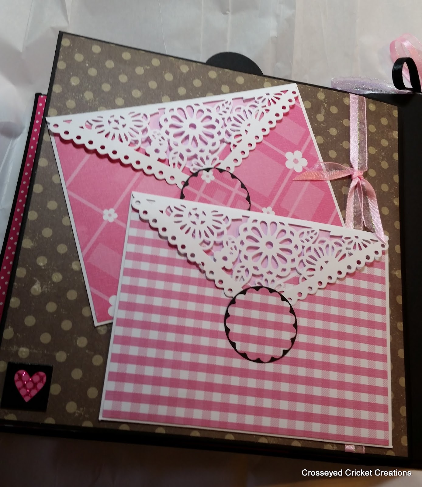 Page 4 has 2 beautiful fancy cut envelopes held closed with a 'tuck behind' scalloped circle that matches the envelope paper. Personal notes or journaling would be perfect here out of site if it isn't to be read by all.