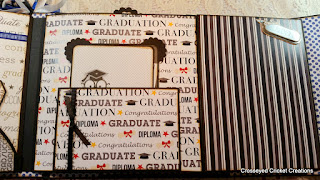 The cover! Pretty black and blue papers and graduating embellishments decorate this special album. "Class of '15" of course has a front cover place and I wanted to add inter-actives even there. I put pockets all the way across the bottom cover with mats/tags that can hold pictures and or journaling. Also on the bottom of the larger pocket there is a side stop saying "We Did It" that holds another mat/tag.