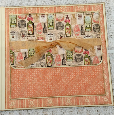 Turning the page, you will find a beautiful papered page with a bottom lacey pocket embellished with a pretty coordinating colored seam binding ribbon.